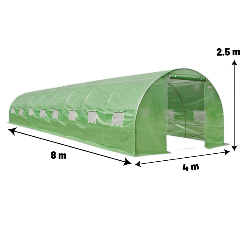 Sera 8x4x2,5mcu cadru galvanizat la bază (carcasă din metal zincat), folie din polietilenă armată 180g/m², țevi galvanizate 26×0,9mm. Acest solar este ideal pentru înființarea culturilor de primăvară, pentru culturile de vară, toamnă și iarnă. Cu cei 32m² se asigură spațiu suficient pentru însămânțarea, răsădirea și creșterea legumelor și plantelor. Plantele vor fi protejate adecvat de vânt, ploaie, grindină, zăpadă, lumina puternică a soarelui și de daunele provocate de păsări. Pelicula armată, specială, ajută la creșterea optimă a plantelor.